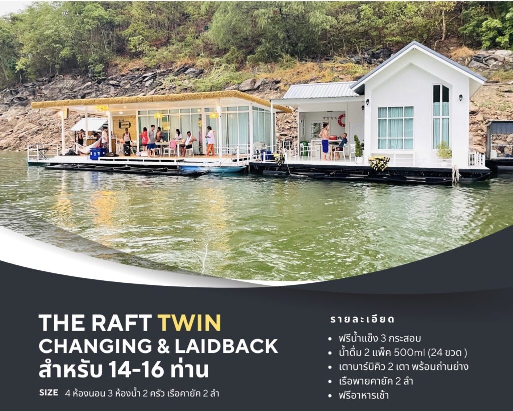 แพขนาดกลาง คอนเซปบ้านลอยน้ำ อิสระและส่วนตัว สามารถพักได้ตั้งแต่ 4-6 คน 2 ห้องนอน 1 เตียง 5 ฟุต มีเตียงเสริม 2เตียง 1 ห้องน้ำ 1 ห้องครัว โต๊ะบาร์ โถงทานอาหาร พร้อมอุปกรณ์ทำครัวครบ มีเรือคายัคให้พายเล่น มีแพยางไว้นั่งเล่นหน้าที่พัก ให้บรรยากาศพักผ่อนเหมือนได้อยู่บ้าน พักผ่อนกับครอบครัว กลุ่มเพื่อนได้อย่างอบอุ่น ถ้าคุณก็เป็นอีกหนึ่งคนที่กำลังหาที่พักผ่อนฮิวใจให้ The Raft ของเราขอเป็นตัวเลือกที่จะมอบสิ่งที่คุณต้องการได้อย่างสมบูรณ์แบบ